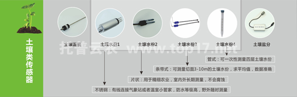 土壤熱通量傳感器,采用熱電堆測量溫度梯度,能廣泛用于測量土壤的能量平衡和土壤層的熱傳導率。土壤溫濕鹽三合一傳感器,能同時測量土壤溫度、濕度、水分三個參數。不銹鋼材質土壤水分傳感器,其防水等級高,能在野外隨時隨地開展測量任務。管式水分傳感器,不同深度土壤參數同時監測,監測深度最深達2米,可按需配置。