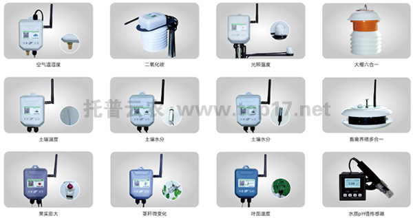 在農業氣象方面,目前有空氣溫度、濕度、光照強度、光合有效輻射、二氧化碳、雨量、蒸發、風速風向、大氣壓、總輻射、紫外輻射等傳感器。同時,還有應用于畜禽養殖監測的氨氣、硫化氫等傳感器,應用于水質監測的pH、余氯、濁度、溶解氧、氨氮、水溫等傳感器,應用于環境監測的一氧化碳、二氧化碳、甲醛、PM2.5、PM10等傳感器。