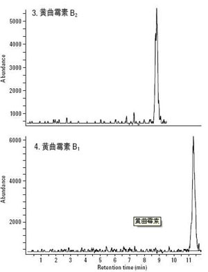 黃曲霉素是黃曲霉菌、寄生曲霉菌產(chǎn)生的代謝物,劇毒,同時(shí)有致癌、致畸等作用。會(huì)引起人體骨骼,內(nèi)臟器官等的病變,甚至癌變。黃曲霉菌廣泛存在于土壤中,因此一般的作物如花生、玉米、大米等農(nóng)作物都很容易感染黃曲霉菌。另外如胡桃、杏仁等干果也可能含有黃曲霉素。黃曲霉素的產(chǎn)生,不僅在種植過程中,還包括加工過程。黃曲霉素分為四種,B1、B2、G1、G2,其中黃曲霉素b1毒性最大。下面介紹下這四種黃曲霉素的MRM色譜圖。