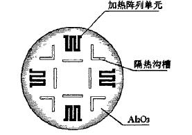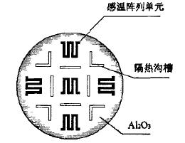 圖1是風速風向傳感器的加熱面。四個對稱分布的加熱陣列單元是加熱芯片,一般為鉑膜熱敏電阻,用于對稱地加熱芯片,使其高于周圍溫度。圖2是感溫陣列單元的陣列芯片,邊上四個呈對稱分布,中間一個芯片用于測量芯片的溫度。