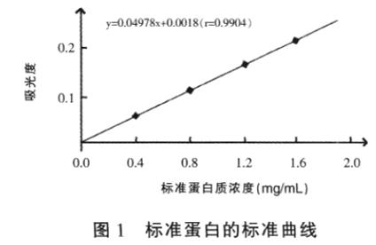 3.1 標準曲線繪制將蛋白質標準液( 7 g/dL) 用0.1 mol/L NaOH 溶液稀釋至4 mg/mL。分別取蛋白質標準液( 4 mg/mL) 0.0、0.1、0.2、0.3、0.4、0.5mL于25 mL 具塞比色試管中, 用蒸餾水補齊至1.0mL, 然后各比色管中加入4.0 mL 雙縮脲試劑, 混勻, ( 37±0.2) ℃保溫30 min。以空白管調零, 用751 型分光光度計在540 nm 波長, 杯徑1 cm, 測定吸光值。以蛋白質含量(mg/mL) 為橫坐標, 以吸光值為縱坐標作標準曲線, 如圖1 所示。