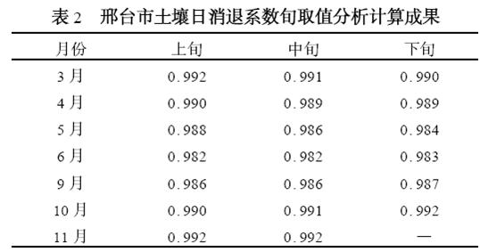 式中: K ─土壤日消退系數;θ1 ─時段初不同深度平均土壤含水率;θ2 ─時段末平均深度的土壤含水率; t ─時段間隔天數。在確定資料時,通過分析,對數據異常的資料將不予采用,這是因為在實際觀測中,由于采用人工取土,難免會存在誤差,還有可能是地面積水等使土壤含水率過大,都會導致資料失真。通過分析篩選后,以達到去偽存真的目的。表2 為邢臺市土壤墑情日消退系數每旬取值分析成果。