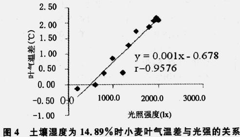 2) 在土壤濕度< 15 %時(shí),小麥葉氣溫差與光照強(qiáng)度線性關(guān)系明顯( r > 0. 9) ,隨著土壤濕度的逐漸增加,兩者之間的線性相關(guān)逐漸減小。在土壤濕度達(dá)到田間持水量的80 %以上時(shí),光照強(qiáng)度不再是影響小麥葉氣溫差的主要因素。