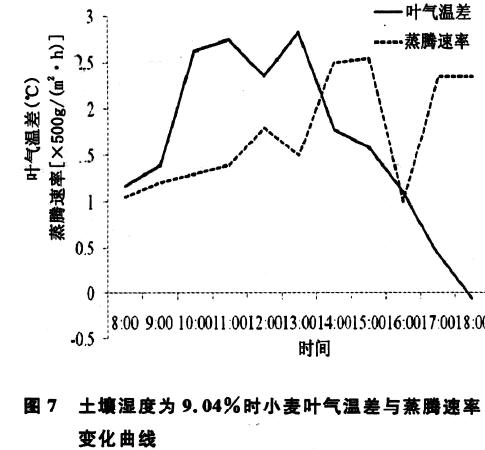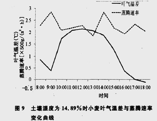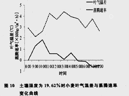 3) 土壤濕度< 15 %時(shí),上午蒸騰速率隨著隨小麥葉氣溫差的增加而加大,12 :00 之后,蒸騰速率并不隨小麥葉氣溫差增加而增強(qiáng),未表現(xiàn)出規(guī)律性。當(dāng)土壤濕度超過(guò)15 %以后,從上午開(kāi)始,小麥葉氣溫差和蒸騰速率的變化趨勢(shì)就相反。