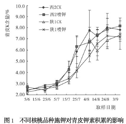 2. 1 噴施硫酸鉀對核桃青皮鉀素積累規(guī)律的影響如圖1 所示,噴施硫酸鉀處理并沒有對2 個核桃品種果實青皮鉀含量造成顯著的影響。在整個果實生長期內(nèi),各處理的果實青皮鉀含量變化曲線相似。6 月5日至7 月5 日,核桃果實發(fā)育進(jìn)入果實迅速生長期和硬核期,青皮鉀含量基本保持穩(wěn)定;之后到8 月7 日核桃果實發(fā)育進(jìn)入油脂轉(zhuǎn)化期,青皮鉀素呈指數(shù)型積累,隨后鉀素積累趨勢變緩。對各取樣時期核桃果實青皮鉀含量進(jìn)行方差分析表明,7 月17 日、7 月25 日、8 月15 日西2 和陜1 ,2 個核桃品種之間青皮鉀素含量差異顯著,噴鉀和對照之間沒有顯著差異;其余取樣時期各處理之間不存在顯著性差異。