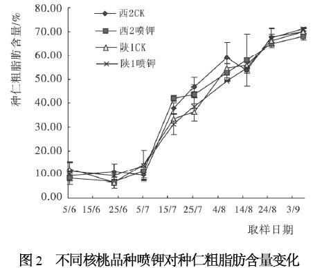 2. 2 噴施硫酸鉀對不同核桃品種種仁發(fā)育過程中粗脂肪含量變化的影響