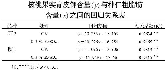 在整個果實生長期內(nèi),各處理的果實青皮鉀含量變化曲線和種仁粗脂肪含量變化曲線都保持著相似的趨勢(如圖1、2) 。由表可知,4 處理的核桃果實青皮鉀含量和種仁粗脂肪含量呈極顯著線性正相關(guān)(4 個處理P <0. 01) ,核桃果實青皮鉀含量與種仁粗脂肪含量之間的線性關(guān)系斜率分別為10. 235 (西2 ,CK) 、10. 296 (西2 ,噴鉀) 、11. 096(陜1 ,CK)和11. 949(陜1 ,噴鉀) ,噴鉀處理的斜率大于對照,陜1 的斜率大于西2 ,表明前者青皮鉀素積累對種仁粗脂肪積累的影響優(yōu)于后者;4 處理相關(guān)系數(shù)分別達(dá)到了0. 9634 (西2 ,CK) 、0. 9465 (西2 ,噴鉀) 、0. 9313(陜1 ,CK) 、0. 9515(陜1 ,噴鉀) 。