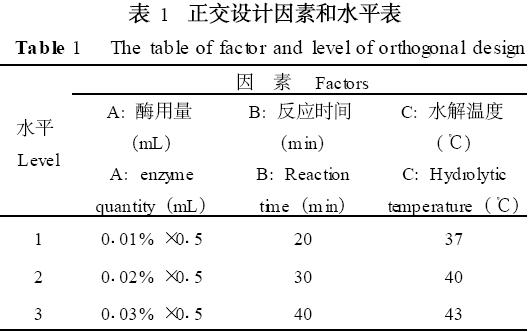 從表3中直觀分析(極差分析) 即R值的大小可以看出, 在試驗(yàn)所選因素的水平范圍內(nèi), 各因素對(duì)水解程度的影響大小順序?yàn)? 水解溫度>酶用量>反應(yīng)時(shí)間; 試驗(yàn)最佳條件為C1A2B1 , 即水解溫度37℃, 酶用量0102% , 反應(yīng)時(shí)間20 min。