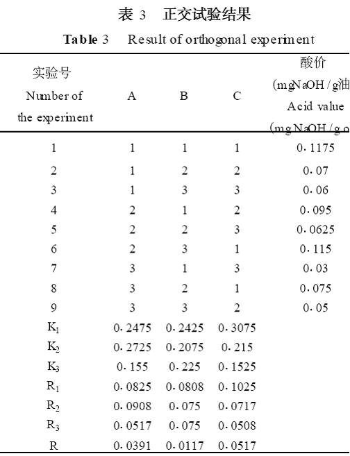 本實(shí)驗(yàn)以10 mL色拉油為底物,以酶用量、水解溫度、反應(yīng)時(shí)間為因素,通過(guò)酸價(jià)的測(cè)定選定其水解的最佳條件。正交實(shí)驗(yàn)設(shè)計(jì)見(jiàn)表1和表2。