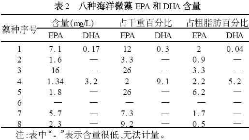 2. 2 八種海洋微藻EPA 和DHA 含量測定結果表2 所示,八種微藻中硅藻門EPA 含量最高,其中3 號藻,EPA 含量為16mgPL ,占干重的26 % ,占粗脂肪的3. 3 % ,幾乎不含DHA ,這一點有助于EPA的提取和純化,可作為工業化生產EPA 的藻株。1號藻EPA 含量為7. 1mgPL ,占干重的12 %;DHA 含量幾乎可以不計。金藻門中4 號藻DHA 含量最高,為1. 34mgPL ,占干重的9. 1 % ,占粗脂肪的5. 2 %。綠藻門中7 號EPA 為5. 7mgPL 占干重的7. 3 % ,占粗脂肪的1. 7 % ,而6 號藻幾乎不含有EPA 和DHA。紅藻門的紫球藻EPA 產量為2. 3mgPL ,占9. 2 % ,占粗脂肪的0. 5 % ,不含有DHA。