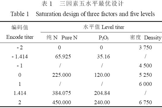 供試品種為青貯玉米品種金坤9 號。試驗設計為施氮量(純N)、施磷量(P2O5)、種植密度(D)3 個因素、5 個水平, 采用311- A 飽和設計, 12 個處理組合(表1, 表2), 重復3 次, 共36 個試驗小區, 每小區面積為15 m2, 行距50 cm。播種期為4 月28 日, 播種前施有機肥22 500 kg/hm2, 磷肥按處理水平作為底肥隨播種一次性施入, 尿素分別在小喇叭口期和大喇叭口期按施肥總量的30%和70%追施, 生育期間結合追肥灌水3 次, 其它管理措施同普通玉米大田。