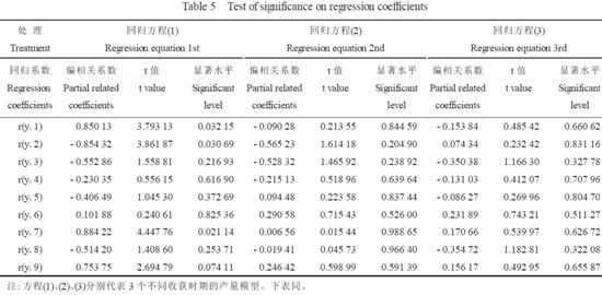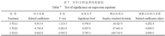 由一次項和二次項的偏回歸系數和t 值(表7、表8)可知, N、P、種植密度單因子與粗脂肪產量的關系, 在8 月11 日和9 月12 日收獲為密度(X3)>P(X2)>N(X1); 8 月26 日收獲為P(X2)>N(X1)> 密度(X3)。兩因子交互效應, 在8 月11 日和8 月26 日收獲為NP>N 密度>P 密度; 9 月12 日收獲為N 密度>NP>P 密度。