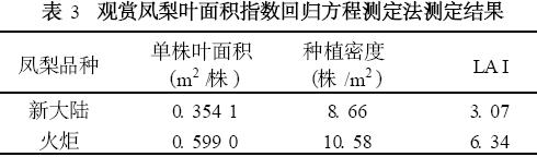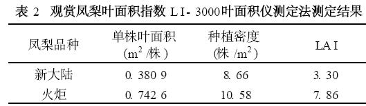 2. 2 L I - 3000葉面積儀測定法的測定結果用L I - 3000葉面積儀測得單株鳳梨的葉面積,然后根據種植密度,計算LA I。葉面積指數(LA I) =單株葉面積(m2 /株) ×種植密度(株/m2 )