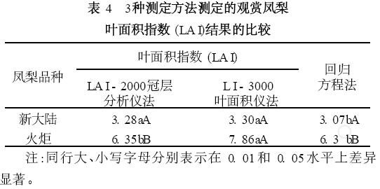 本研究發現,對于溫室觀賞鳳梨的葉面積指數,L I - 3000葉面積儀法的測定結果總體上高于另外2種方法。“新大陸”品種, 3 種方法測定的結果在0. 05水平上沒有顯著差異;而“火炬”品種,L I - 3000葉面積儀法的測定結果與另外2種方法在0. 05和0. 01水平都存在顯著差異。