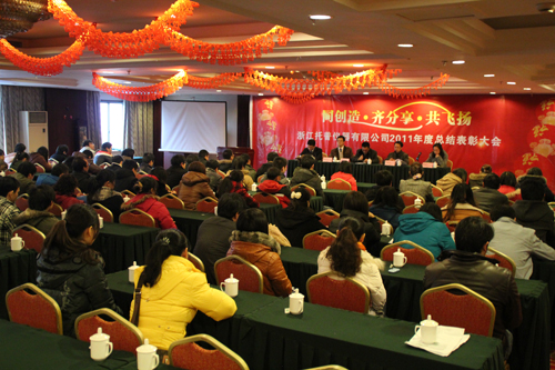 浙江托普儀器有限公司2011年年度總結表彰大會于2012年1月15日在銘泰大酒店七樓會議室圓滿召開。此次會議的主題是“同創造 齊分享 共飛揚”,托普上下110余人齊聚一堂,共同回顧2011年托普儀器的點點滴滴,并對2012年各項工作進行展望。
