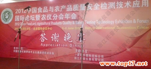 2012年6月4日-6日,2012中國(guó)食品與農(nóng)產(chǎn)品質(zhì)量安全檢測(cè)技術(shù)應(yīng)用國(guó)際論壇暨展覽會(huì)在北京國(guó)際會(huì)議中心隆重舉行,此次展覽會(huì)由中國(guó)儀器儀表學(xué)會(huì)分析儀器分會(huì)和中國(guó)儀器儀表學(xué)會(huì)農(nóng)業(yè)儀器應(yīng)用技術(shù)分會(huì)主辦,浙江托普儀器有限公司應(yīng)邀參加。本屆論壇以“為構(gòu)建我國(guó)食品安全保障體系,進(jìn)一步推動(dòng)食品、農(nóng)產(chǎn)品檢測(cè)新技術(shù)的廣泛應(yīng)用,完善食品與農(nóng)產(chǎn)品質(zhì)檢體系建設(shè)”為主題展開(kāi),托普儀器公司帶去多種農(nóng)產(chǎn)品檢測(cè)儀器:農(nóng)藥殘留速測(cè)儀、植物營(yíng)養(yǎng)測(cè)定儀、果實(shí)硬度計(jì)、土壤養(yǎng)分速測(cè)儀、葉面積測(cè)定儀等,以便與各位參展商進(jìn)行交流學(xué)習(xí),更要向參加論壇會(huì)議的食品、農(nóng)產(chǎn)品監(jiān)管部門的領(lǐng)導(dǎo)和食品質(zhì)檢領(lǐng)域的著名學(xué)者學(xué)習(xí)更多的農(nóng)產(chǎn)品檢測(cè)技術(shù),研發(fā)生產(chǎn)更多高精尖儀器。