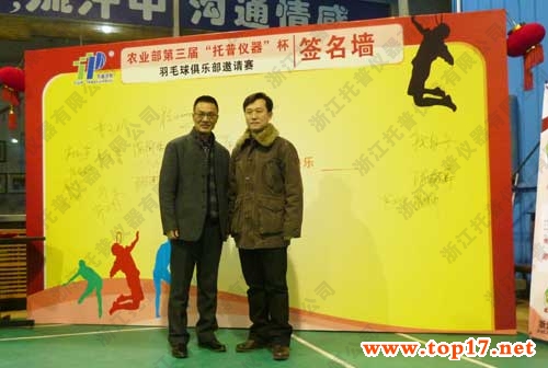 2013年元旦期間,農業部第三屆“托普儀器”杯羽毛球俱樂部邀請賽在北京貝特羽毛球館如期舉行。托普儀器精心準備簽名墻,農業部黨組成員張玉香、部直屬機關黨委常務副書記胡元坤、全國農技中心陳生斗主任、杭大鵬書記與參賽人員紛紛簽名留念。