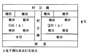 在鄒城街龍橋村選擇地勢(shì)平坦、水源方便、土壤肥力好、交通便利的連片棉田二處,面積共13.33hm²,每處6. 67hm²,將16瓦燈管各12瓦燈管的兩盞電源誘幻殺蟲燈分別懸吊放于這兩處棉田內(nèi),吊裝16瓦燈的6. 67hm²棉田簡(jiǎn)稱1區(qū),吊裝12瓦的燈的6. 67hm²棉田簡(jiǎn)稱2區(qū),每盞幻燈離地1.5m,燈距50m,開展誘殺害蟲實(shí)驗(yàn),詳見幻燈安裝及實(shí)驗(yàn)分區(qū)位置圖。