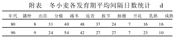 通常以每年第一次5日平均氣溫<0e的最后一天定為越冬開始期;或冬季氣溫常年在0e左右擺動的地區,以小麥植株高度變化而定。通過對駐馬店市歷年逐日平均氣溫統計分析發現:20世紀80年代以前,12月下旬至2月的大部分間里5日平均氣溫都在0e以下或在0e左右擺動。90年代以后,氣溫已發生明顯變化,12月及2月下旬5日平均氣溫<0e日數基本消除,1月~2月中旬也只有在個別年份的個別時段內5日平均氣溫<0e,其它時段都在0e以上;從生長高度來看,越冬期內,植株并沒停止生長,而是有微弱的上升。因此近幾年來,在本區越冬開始期已很難確定。根據作物觀測,20世紀80年代越冬日期平均在1月2日,90年代以后越冬日期平均在1月8日,越冬期明顯滯后,尤其是2001~2002年度竟無越冬現象。由附表也可看出,90年代以后分蘗期延長,返青期提前,越冬期相對縮短。種種跡象表明,隨著氣候的逐漸增暖,本區冬小麥已沒有明顯的越冬期。