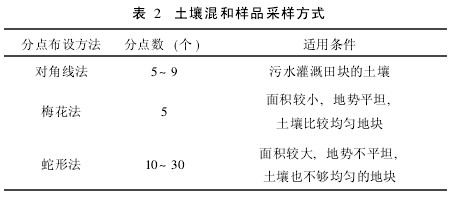 在土壤環(huán)境質(zhì)量監(jiān)測工作中,一般采集混和土樣,即在一個采樣區(qū),把多點采集的土樣混合成一個樣品,一方面可以減少分析量,另一方面可以把采樣區(qū)微量不均勻性的影響減到最低限度。采樣時應沿著一定的路線,按照/隨機0、/等量0和/多點混合0的原則進行。在該次土壤調(diào)查中常用的多個采樣點的布設方法是:對角線采樣法、蛇形采樣法和梅花形采樣法等,其適用條件和采樣的分點數(shù)見表2。
