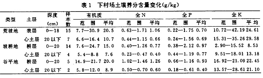 從表1可知,心土層(一般為20cm以下)土壤全量養(yǎng)分除全K外普遍低于表土層。占全場面積一半以上的坡耕地土壤除全磷略高于荒坡地和谷平地外,全氮、全鉀、有機(jī)質(zhì)含量均低,特別是全K含量遠(yuǎn)低于荒坡地和谷平地。從養(yǎng)分三要素含量來看,下村場土壤的氮素供應(yīng)狀況差,磷素供應(yīng)亦不足(全磷含量低于。.8一1.09/kg以下),而鉀素的潛在供應(yīng)能力荒坡地和谷平地較強(qiáng),坡耕地的供鉀潛力表現(xiàn)為低,這可能與其開墾利用、分解淋溶有關(guān)。