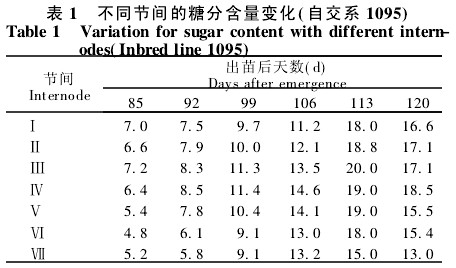 2.2 不同節間糖分含量的變化 就高糖系1095而言,一共7個節間,6個測定時期中的4個時期糖分含量最高值出現在第?節間,2個時期是第?節間的含糖量最高(表1)。就低糖系N3來說,情況與高糖系1095相比,略有不同。親本N3共有6個節間,6個測定時期中的4個時期是第?節間含糖量最高,g個時期(106 d)是第?節間含糖量最高,另一個時期(99 d)是第?節間含糖量最高。據此,作者認為高粱莖稈中糖分含量最高的節間應該是中部節間或上一節間,這將給準確測定高粱莖稈中糖分含量提供理論依據。