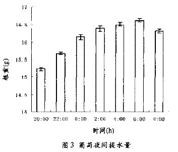 利用電子天平實時監測夜間水分從飽和含水量一側的根系進入干旱一側根系的水量。結果表明(圖3):從晚上8:00開始,干旱一側根重持續增加,至早晨6:00達到最高,實際增加水量為1.4g,有光照后開始減少,表明夜間當葡萄蒸騰處于停止狀態時,水分可以從濕根一側傳遞到干根一側,表現出明顯的提水作用,而白天當蒸騰增大時,干旱一側根系的含水量又開始降低。