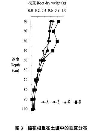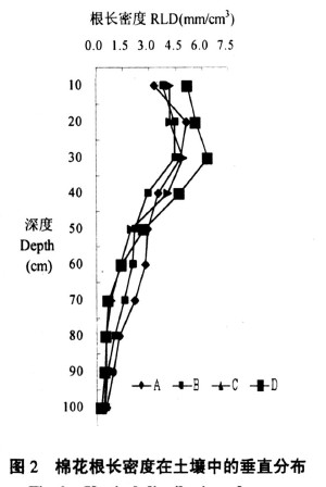 在有殘膜的土壤中(0~40 cm),根系表面積隨殘膜量的增加而增加,且各層的根系表面積占棉花總根表面積的比例也是逐漸增大的,在0~40 cm土層中A的根系表面積為1 656.27 cm2,占總量的55.74%,而D卻達到了2 800.08 cm2,占總量的74.74%,較處理A高69.06%;但在沒有殘膜的土壤中(40~100 cm),情況卻相反,根系表面積總的趨勢是逐漸減少的,在40~100 cm土層中,無論A的根系表面積還是其占總量的比例均大于其它處理。以上說明在0~40 cm土壤中,由于有殘膜的存在,產生了一定的土壤機械阻力,但這種阻力不僅沒有阻礙根系的生長,反而刺激了根系的生長發育,使棉花根系大量增生,根表面積也隨之增大;由于上層根系受到殘膜刺激,根系大量增生,所以其吸收的養分也大量的消耗在根系增生上,使根系下扎的力量減弱,下層根系不能正常生長,導致了B、C和D的下層根表面積減少,降低了其對深層水分和養分的吸收利用,減弱了棉花的抗旱能力。表2根長密度(RLD)為單位土壤體積內的根系長度。研究結果表明,處理間的棉花根長密度在不同土層有較大的差別。在0~40 cm各土層中,處理A的根長密度與B極為相近,略小于C,但A和D有較大的差別,在4個土層中均小于D的根長密度;在40~100 cm的各土層中,各處理間的根長密度呈遞減的趨勢,只是A和B下降的較為緩慢,C和D下降較快。這說明,當殘膜量為900 kg/hm2時,殘膜能夠刺激棉花根系的生長,使根系大量增生,增大了土壤中的根長密度,這種現象一方面加劇了土壤中根系對水分、養分的競爭,并可能誘導早衰,另一方面在40~100 cm土體中根系密度較低,對水分養分的利用不充分;當土壤中沒有殘模時,棉花根系的空間分布更為合理,下扎根系較多,能夠提高根系對土壤深層水分和養分的利用效率。圖2在0~40 cm土層,棉花根重在土壤中的垂直分布趨勢與圖2相似,D的根重最大,而其它3個處理差別不大,表明土壤中存在大量的殘膜時能夠刺激根系生長。在40~100 cm土層,各處理間相差不大,但D的根重卻大幅度下降,這可能是由于上層根系消耗了大量的養分,向下層根系輸送的養分相對減少,導致下層根重降低。