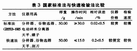 由表1,2可知,碎米含量檢驗(yàn),快速法與標(biāo)準(zhǔn)法比較,結(jié)果誤差,標(biāo)一早米為+0.6%,標(biāo)一晚米為一0.4%,均小于土2%,檢驗(yàn)時(shí)間縮短20 min。大米碎米含量快速法具有誤差小,速度快、時(shí)間短的優(yōu)點(diǎn),可應(yīng)用于大米生產(chǎn)、銷售中碎米含量的檢驗(yàn)與控制。