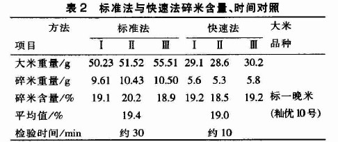 從檢驗(yàn)過(guò)雜質(zhì)的大米樣品中,用分樣器平均分取約25g大米,倒人合適也徑的篩層內(nèi),以每秒1轉(zhuǎn)的速度,回轉(zhuǎn)半徑約10 cm,在玻璃板上正反時(shí)針回轉(zhuǎn)各篩10圈,取出篩,將篩上大米小心倒在玻璃板一端,將篩下物倒人樣品盤(pán)內(nèi),重新套好篩層,再將篩下物倒人篩內(nèi),以同樣的方法再篩選2次。第二次正反時(shí)針回轉(zhuǎn)各篩8圈,第三次篩4圈。將篩上物和篩下物分開(kāi)倒在玻璃板上。按規(guī)定揀出碎米中的整米、整米中的碎米,用感量0.1 g的天平稱取碎米重量,計(jì)算碎米含量,記錄每次檢驗(yàn)時(shí)間。檢驗(yàn)結(jié)果對(duì)照見(jiàn)表1、表2