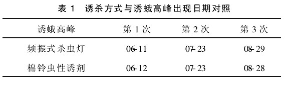 表1可見這兩種方式的誘蛾高峰日期基本一致,說明太陽能殺蟲燈用于害蟲發生動態的監測是可行的,可為生產提供及時準確的防治依據。