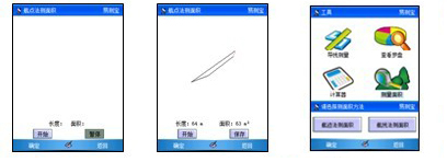 “遇障礙物測量”功能:當(dāng)遇到障礙物時點測量界面的“暫!,饒過障礙物后,點擊“繼續(xù)”,GPS重新開始記錄軌跡,同時將暫停前后的起止點自動連接在一起,使所測的面積值更準確